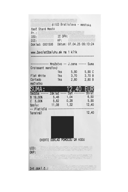 - Žiadne zvýrazňovanie položiek: Daňový kód pokladnice, dátum, čas ani suma už nemusia byť graficky odlíšené (napr. tučným písmom).