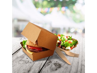 Ekologický materiál z recyklovaného papiera je plne rozložiteľný a šetrný k životnému prostrediu, čo ocenia prevádzky orientované na udržateľnosť. Box je vhodný na teplé aj studené jedlá, od hamburgerov cez sendviče až po rôzne street food špeciality. Box poskytuje dostatok priestoru pre štandardné burgre.