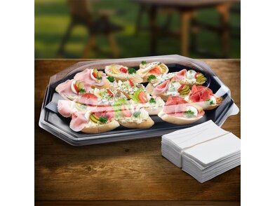 Viečko vďaka vypuklosti bráni poškodeniu obsahu podnosu. Hodí sa do gastro sektoru, na jarmoky, festivaly, ochutnávky, akcie s cateringom, posedenia.
