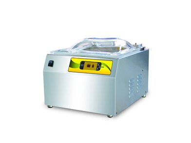 Zariadenie na vákuové balenie vhodné do väčších prevádzok na balenie potravín. Zariadenie najskôr odsaje vzduch z komory, resp. zo sáčku a potom sáčok zavarí. Vákuové balenie môže predĺžiť trvanlivosť mäsa, rýb, syrov, zeleniny a pod. Digitálne ovládací panel, vaňa komory so zaoblenými rohmi, priehľadné veko.