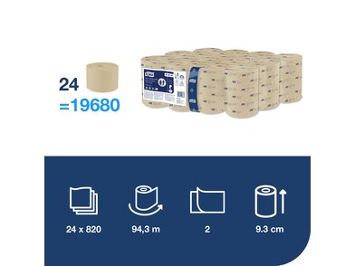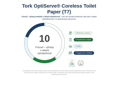 S dĺžkou kotúča 94,3 m a šírkou 9,3 cm poskytuje až 820 útržkov, čo znamená menej časté dopĺňanie a úsporu času personálu. Tento toaletný papier je kompatibilný so zásobníkmi Tork Elevation T7, ktoré sú navrhnuté na vysokokapacitné použitie a zabezpečujú hygienické a efektívne dávkovanie. Vysoká kapacita, jednoduchá údržba a praktické použitie robia z Tork OptiServe® spoľahlivého partnera do každého komerčného prostredia, kde je dôležitá čistota a komfort používateľov.