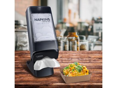 Zásobník má v sebe plochu s pružinou, ktrorá servítky posúva k otvoru na vyťahovanie, čo podčiarkuje komfortné vlastnosti výrobku. Je uzamykateľný západkou. Do zásobníka viete dostať až 500 servítkov.