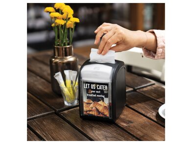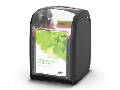 Tork Xpressnap Fit® stolový zásobník je navrhnutý pre moderné gastro prevádzky, ktoré hľadajú efektívne, hygienické a estetické riešenie pre podávanie servítok. Vďaka kompaktnému dizajnu sa zmestí aj na menšie stoly, pričom jeho elegantné prevedenie v čiernej farbe je navrhnuté tak aby ladilo s každým interiérom a zároveň pôsobilo profesionálne a elegantne. Zásobník je ideálny pre reštaurácie s obmedzenými službami, kde je dôležité, aby si zákazník mohol jednoducho a hygienicky vziať servítku.