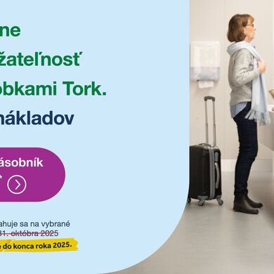 *Akciová cena prenájmu je čistá cena a vzťahuje sa na vybrané zásobníky Tork. Akcia trvá od 1. apríla do 31. decembra 2025 alebo do odvolania.